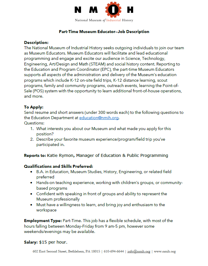 The National Museum of Industrial History seeks outgoing individuals to join our team as Museum Educators. Museum Educators will facilitate and lead educational programming and engage and excite our audience in Science, Technology, Engineering, Art/Design and Math (STEAM) and social history content. Supervised by the Education and Program Coordinator (EPC), the Museum Educator paid interns support all aspects of the administration and delivery of the Museum’s education programs which include K-12 on-site field trips, K-12 distance learning, scout programs, family and community programs, and more. This internship has a flexible schedule, with most of the hours falling between Monday-Friday from 9 am- 5pm. Some weekends/evening hours may be available.