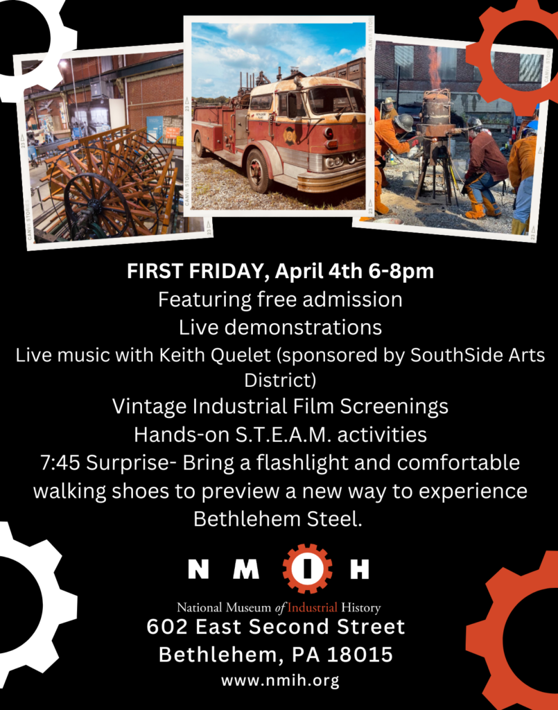 Join us for SouthSide Arts District’s First Friday, April 4th for extended hours and free admission from 6-8pm. Enjoy live music, live machinery demonstrations, vintage film screenings and family-friendly S.T.E.A.M. activities.